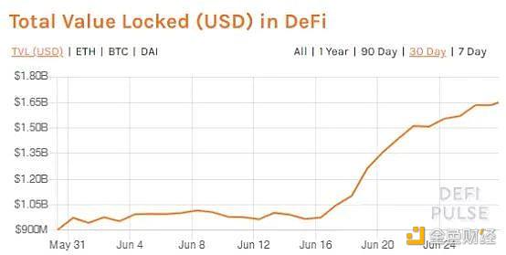 312之前,DeFi锁定的资产价值最高达约12.5亿美元,经过3个月的恢复,最终在6月初回到了312之前的水平。截至6月27号,锁定在DeFi内的资产达到了16亿美元。