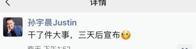 孙宇晨在6月1日和6月2日分别通过微信朋友圈发布了两则消息,一则是“干了件大事,三天后宣布”。