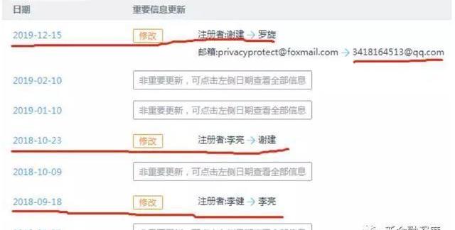 此外,查询ve-china.com.cn的历史注册人,域名一开始的注册人叫李建,在2018年9月变更为了李亮,再过一个月又变更为了谢建,又过了一年多又变更为了罗旋。