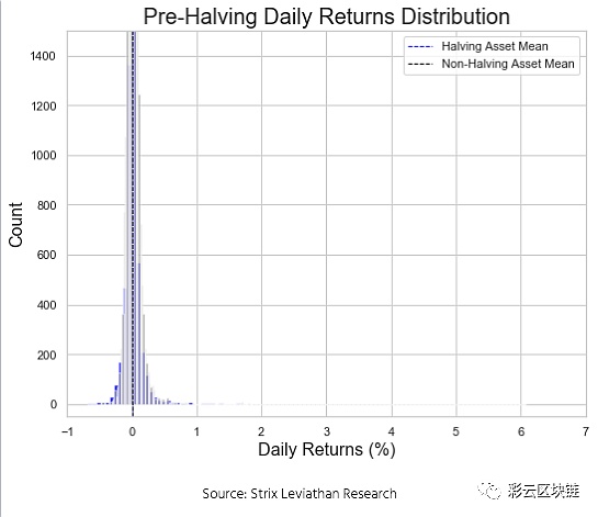 利用统计分析来确定没有减半的资产的减半的加密资产收益分布在统计上是否不同。在讨论结果之前,值得确认的是,如果减半事件导致资产的供求关系发生根本性变化,我们会作两个假设:矿工奖励减少后,供应相对于需求的突然突变将很快以资产价格表示出来。在减半后的时间内,减半的加密货币将跑赢其他市场,因为一组资产的矿工抛售压力降低了。