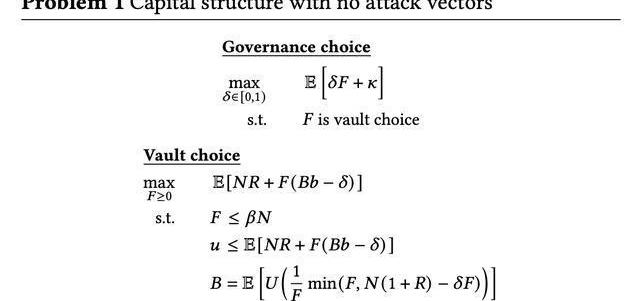 4.1.2问题2:存在治理攻击的资本结构。我们考虑在和中描述的形式的治理攻击向量。在这种攻击中,拥有部分GOV治理代币的代理能够窃取系统中部分抵押品。如中所述,这种情况可能发生在Maker系统中,此时=0.1且=1,因为治理被授予任意更改合同的权力。