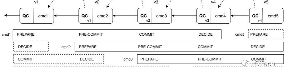 可以发现在BasicHotStuff中的各个阶段流程都高度的相似,HotStuff的作者便提出了ChainedHotStuff来简化BasicHotStuff的消息类型,并允许BasicHotStuff的各个阶段以流水线方式进行处理交易。