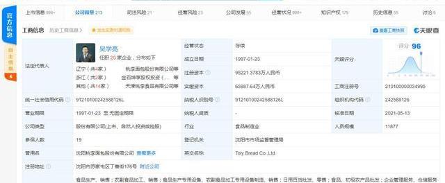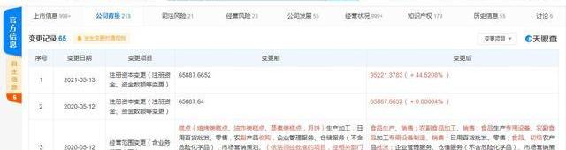 天眼查App显示,5月13日,桃李面包股份有限公司发生工商变更,注册资本由约6.6亿人民币增至约9.5亿人民币,增幅超44.5%。