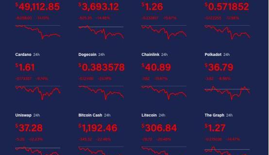 彼时比特币闪崩也带动加密货币集体大跌。在比特币跌破5万美元关口时,瑞波币跌幅逾15%,以太坊跌超9%至2253美元附近。在比特币日内暴跌15%时,以太坊暴跌20%,币安币暴跌17%,瑞波币暴跌26%,狗狗币暴跌19%,莱特币暴跌28%。