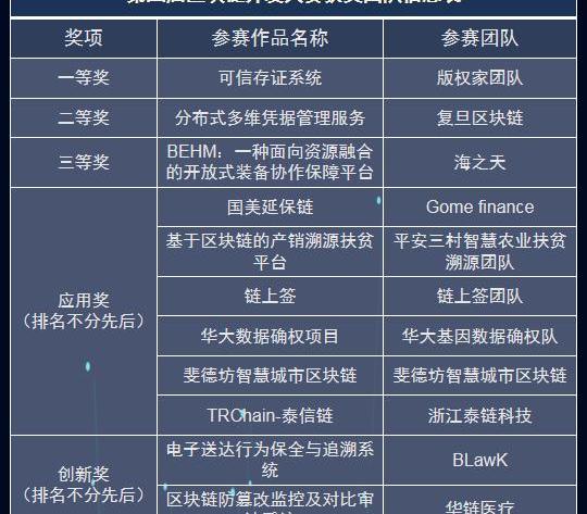 本次大赛还得到了以下行业组织和地方协会的支持:北京区块链技术应用协会、上海区块链技术协会、天津市软件行业协会区块链分会、浙江省区块链技术应用协会、浙江省西子区块链研究院、湖南省区块链协会、福建省区块链协会、四川省区块链行业协会、河南省区块链产业联盟、中国物流与采购联合会区块链应用分会、深圳市金融区块链发展促进会、广州市区块链产业协会、南京区块链产业应用协会、苏州市区块链技术和产业协会、武汉市区块链协会、无锡市区块链产业联盟、中国电子信息行业联合会电子签名与可信服务发展联盟、中国人工智能开源软件发展联盟。