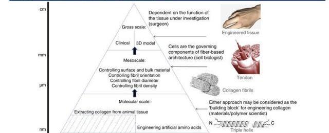 胶原工程分类为三个层次:1)胶原蛋白分子层次:可从氨基酸层面人工重组成胶原蛋白肽进而合成具备三螺旋结构的胶原蛋白,另也可直接从动物组织中提取胶原蛋白;2)胶原原纤维层次:原纤维密度、直径、排列等结构特性影响胶原纤维的材料特性;3)最终临床3D模型层次:基于不同性状、功能和质地的胶原蛋白,应用于组织和器官,如止血胶原海绵、胶原蛋白植入物、细胞支架等。