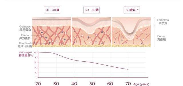 胶原蛋白与细胞衰老息息相关。人体皮肤衰老的本质是真皮层细胞老化,经由表皮层呈现;胶原蛋白在皮肤组织中含量高达70%,在真皮中含量占比约75%,不仅联合弹力纤维支撑着皮肤的基本结构,也对皮肤的水润、弹性和质地起到关键作用,但随着年龄增长,成纤维细胞活性降低、人体内胶原蛋白大量流失、透明质酸等基质的分泌也随之减少,出现皮肤松弛、下垂、皱纹、干燥、色素色斑、失去弹性等面部表现。