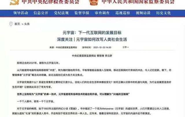 2021年12月23日,中央纪委国家监委网站发布了一篇名为《元宇宙:下一代互联网的发展目标深度关注|元宇宙如何改写人类社会生活》的文章,提出世界上没有称为“元宇宙”的单一技术,元宇宙是现有各种技术的组合和升级,可以理解为“3D版的互联网”。虽然元宇宙为互联网行业的未来指明了方向,但元宇宙也存在很大的泡沫。