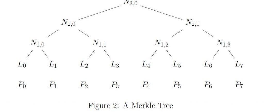直观来讲,我们可以认为默克尔树是使用哈希函数将一个有序的数值集压缩成一个单一的数值,其方式是很容易证明一个数值属于原来的数值集。更具体地说,Merkle树可以从O的公钥的一个有序集合P0...Pm的OTS的公钥和哈希函数H,以如下方式构造: