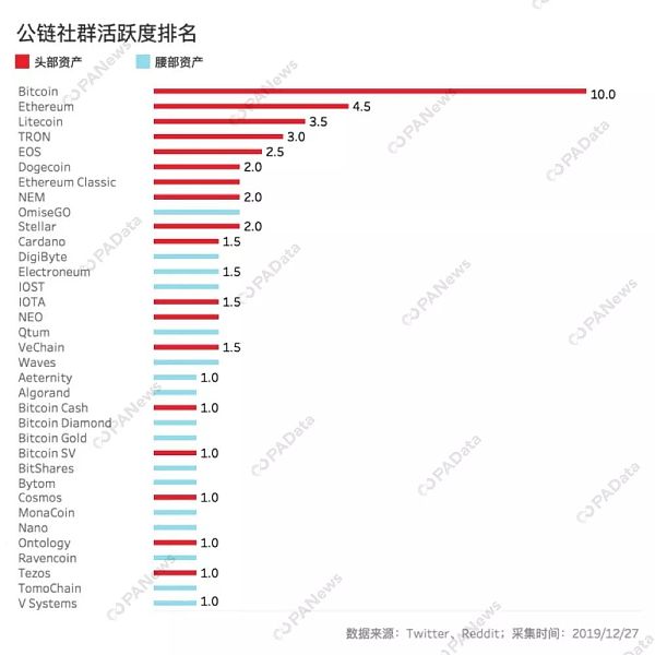 PAData将两个网站上的粉丝数分别从高到低排序后进行10-0分的赋值,并按照各50%的权重计算总分,总分越高则说明这个公链项目流量越多,社区越活跃。根据统计,截止12月217日,比特币是粉丝最多的公链,其次,以太坊、Litecoin和TRON以加权总分4.5、3.5和3.0构成第二阵营。
