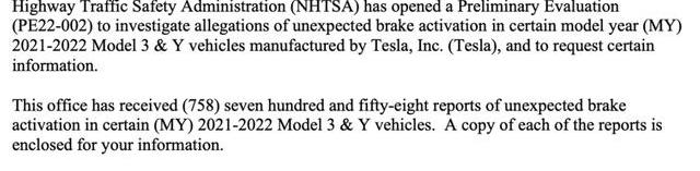 NHTSA于2022年2月针对特斯拉“幽灵刹车”报告,图源NHTSA官网