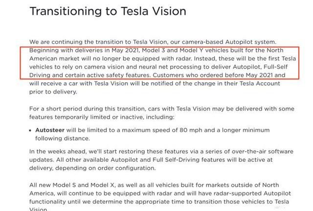 特斯拉针对取消毫米波雷达的声明,图源特斯拉官微