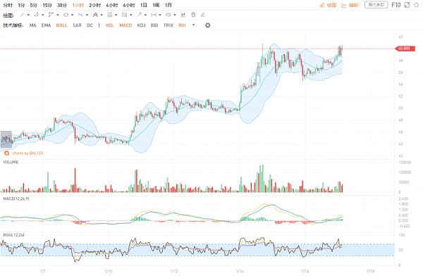 LTC也来到前日高点,目前在60美元僵持,并未出现明显放量,且并未突破前高,短时区间震荡的可能性较大。