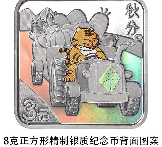 8克正方形银质纪念币背面图案以虎、拖拉机、瓜果蔬菜为主要设计元素,展现秋分时节丰收景象,并刊“秋分”字样及面额。