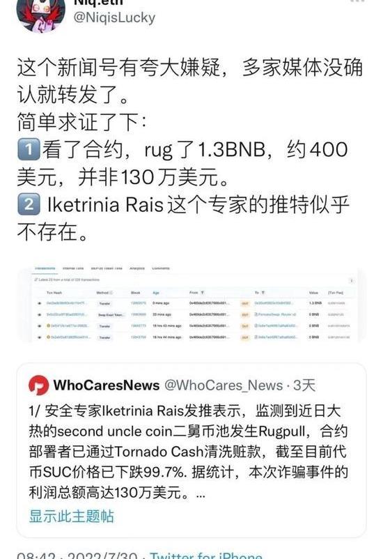 晚上22点,空投的24小时期限将过一半,另一个推特账号‘WhoCaresNews’突然表示,二舅币的合约部署者被检测到已通过加密货币交易平台TornadoCash,把炒高了的二舅币中自留的那部分脱了手。