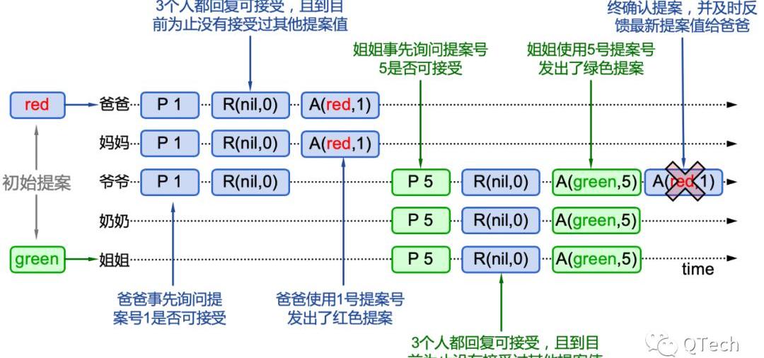 通过上面的问题,我们发现,为了防止整个决策进入到一种无法终止的状态,我们还需要通过某种方式对提案进行排序,从而拒绝一些旧的、无效的提案,并及时地向提案者反馈自己接受的提案值,避免提案者一直发起相同的提案。也就是说,如果爷爷在收到爸爸的延迟提案时,能够知道先前已经存在一个更新的提案并拒绝旧提案,同时告知爸爸已经接受了姐姐的绿色提案的话,就可以避免出现多种提案达到选定状态的困境。