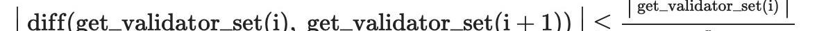 在下面的设计中,我们修改了CONSENSUS,以便在每个视图中,需要最终性的集合是不同的。也就是说,CONSENSUS将一个函数get_validator_set(view_number:int)->Map作为输入,而不是验证器集,它可以为新视图生成验证器集。get_validator_set应该具有以下属性:验证器集根据从一个视图到下一个视图的最大1/r值进行更改,其中r是恢复期长度。更正式地说,我们想要: