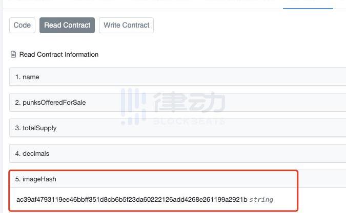 我们通过刚才的方式查询CryptoPunks的合约地址,发现并不能找到TokenURI或类似字段。但是可以看到在第5个函数imageHash中返回了一串哈希值,这便是由整个10000张CryptoPunk图片拼接而成的一张大图的哈希值。这张图片目前保存在项目的官方网站上,用户可以自行下载该图片并计算其哈希值并与链上的哈希值进行对比以验证图片的真实性。
