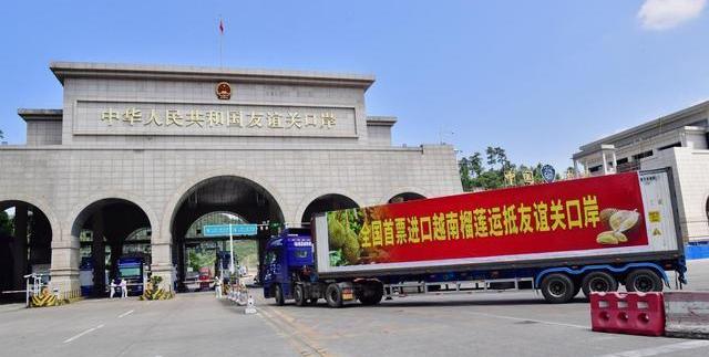 位于中越边境广西凭祥市的友谊关口岸车水马龙,装载着东盟进口水果的出入境车辆来往不断。2022年9月19日,一批重量18.24吨,货值51.24万元人民币的越南榴莲运抵友谊关口岸。经友谊关海关关员核查相关证书和标识,检验检疫合格后顺利通关,这是越南首批出口中国的鲜食榴莲。