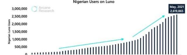 关于下一个可能大规模采用比特币的国家的猜测一直备受关注。萨尔瓦多赋予比特币法定货币地位的新法律令人兴奋,该法案获得批准后,世界各地的许多家和政府官员都表示了支持采用比特币的立法。与此同时,一些知名人士要求本国政府采用比特币标准。NFL的职业足球运动员RusselOkung向尼日利亚政府发出了一封建议书,表示应该跟随萨尔瓦多的脚步。他的论点基于“每个国家最终都会采用比特币,而首先采用比特币的国家将会受益”的观点。Okung声称尼日利亚受到了中央银行、通货膨胀和法币本位制的影响。正如最近ArcaneResearch公司的一份报告指出,尼日利亚采用比特币的比例正在上升。如下图所示,自2017年1月以来,Luno钱包上的尼日利亚用户数量呈指数增长。