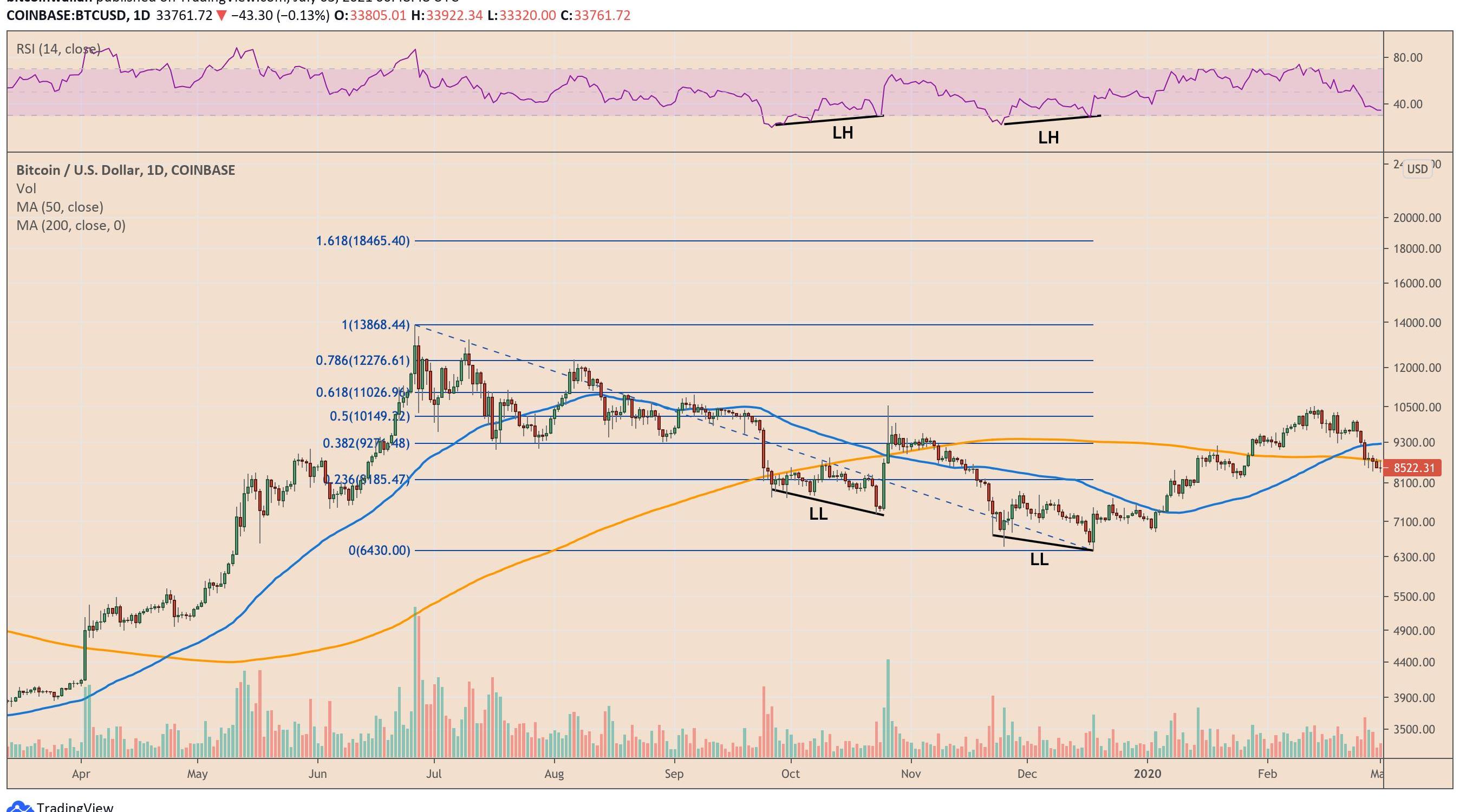2019年的分形图还说明了至少两种看涨背离情况,其中比特币价格形成了较低的低点,而其每日相对强度指标出现了较低的高点。它暗示了当前看跌势头的疲软。而事实证明,价格后来飙升。
