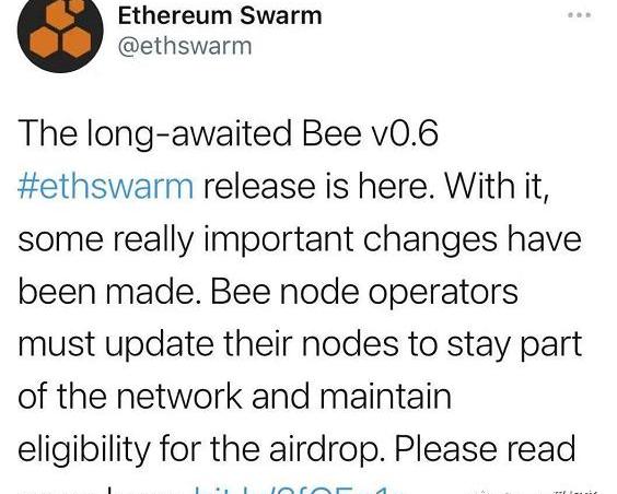 2021年6月4日,Swarm基金会官方推特发布最新消息称:Bee主网软启动将于6月13日进行。
