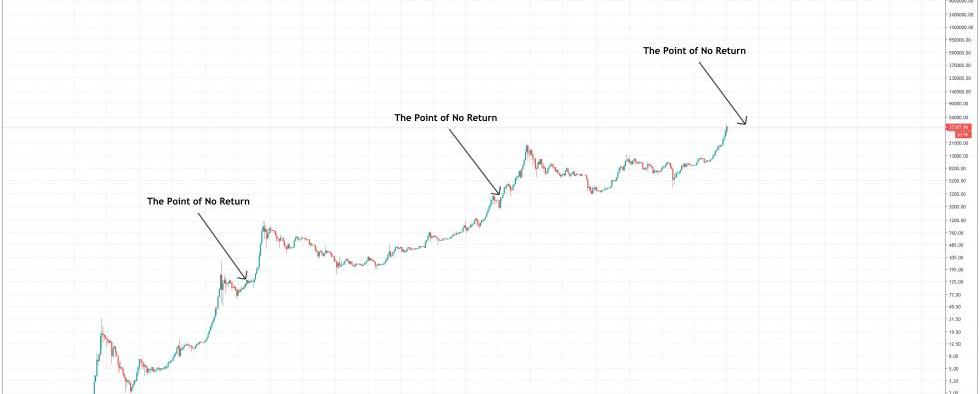 上面的图表演示了“不归路点”是什么样子的,从那时起,以市值计算的领先的加密货币比特币,其价值增加了600%至800%。?