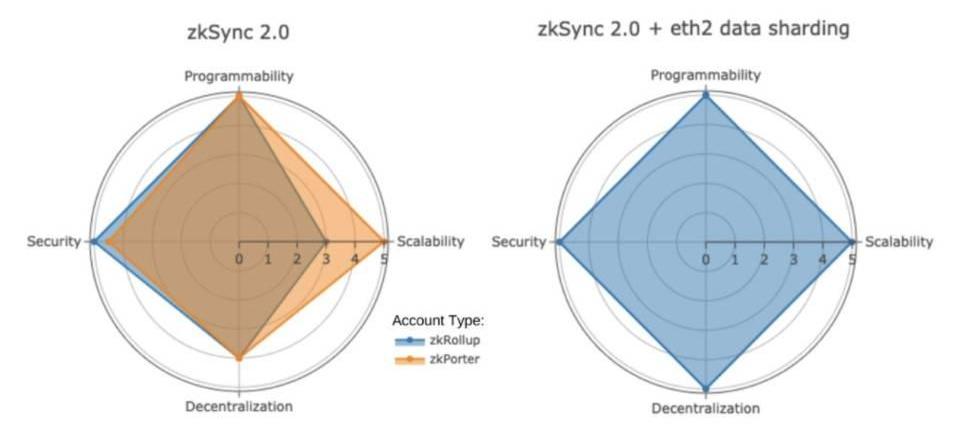 考虑到当zkPorter在4月公开部分细节后VitalikButerin就质疑了其安全性无法媲美OptimisticRollup,MatterLabs这次还特意制作了这个「zkSync2.0和ETH2数据分片」组合的图表,可能是在迎合以太坊社区,展现出最完美的按层级和需求的综合扩容方案。