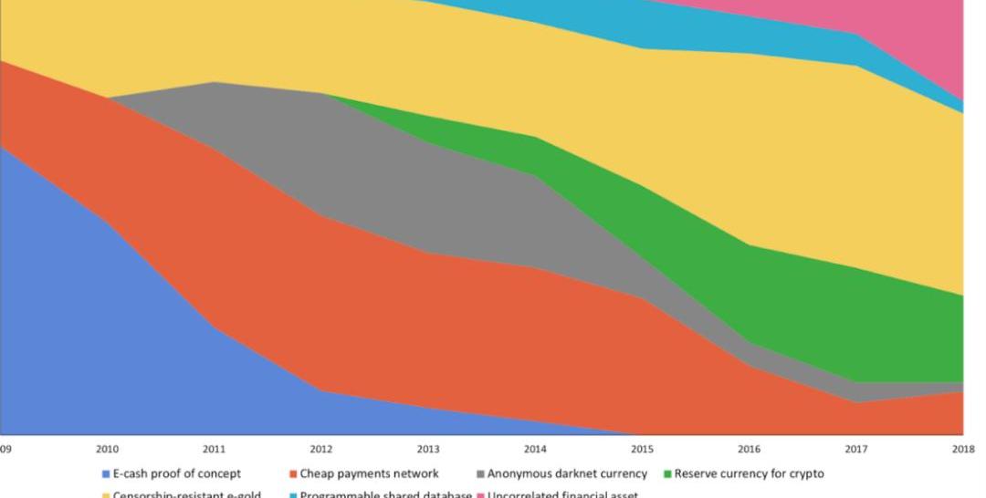 随着比特币开始向早期应用者传播,定位和叙述自然开始转变。早期应用者是一种罕见的有远见的人,他们有洞察力,能将一项新兴技术与战略机会相匹配。这些有远见的人推动了高科技创新的发展,因为他们看到了一个数量级的变化的潜力。随着早期应用者的加入,围绕比特币的流行说法转向抗审查的电子黄金、加密货币的储备货币和不相关的金融资产。早期应用者看到了比特币这种资产的潜力,并推动叙述集中在这种潜在的用例上。这些早期应用者的信念和叙述将比特币这种资产从创新者阶段带到了早期应用者阶段。鉴于这种叙述的转变,在过去的几年里,大多数比特币用户购买比特币作为投资资产,这并不令人惊讶。