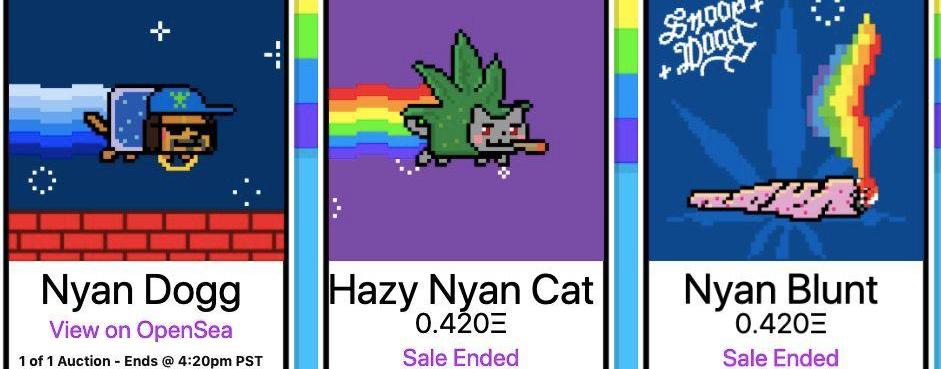 今年4月,SnoopDogg与彩虹猫在OpenSea合作发售NFT收藏品,其中“HazyNyanCat”系列与“NyanBlunt”系列为限量款,售价均为0.42ETH,“NyanDogg”为拍卖款,目前最高出价16ETH。