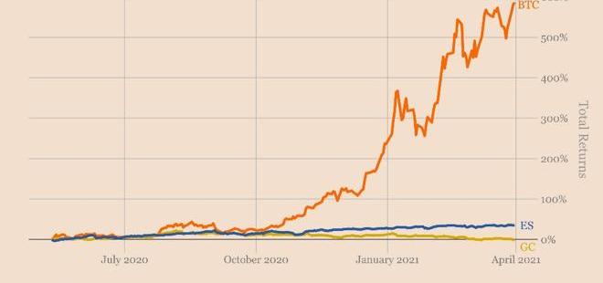 目前市场正在对比特币和黄金做出定价。两者相比,显然市场更看好比特币。下图显示比特币在2020年减半以来,比特币,黄金和S&P的投资收益比较。
