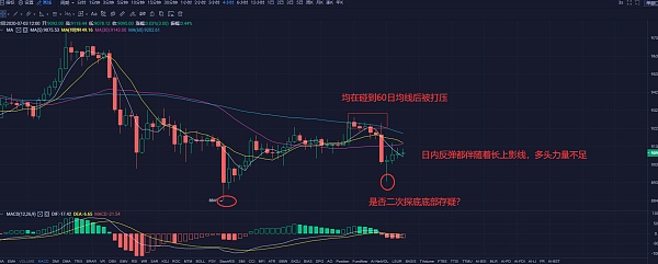 4小时级别看起来更为明显,昨日K线在多次碰到60日均线被打压,最后迅速跳水,但跳水后走了个海底捞月形成长下影线的小阳线,颇有些反转的意味。