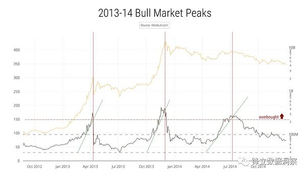 2013~2014比特币牛市顶点与NVT Signal的契合(2013年4月、2014年1月、2014年7月NVT超过150点,同时BTC价格达到阶段顶点,是不错的卖出点。)