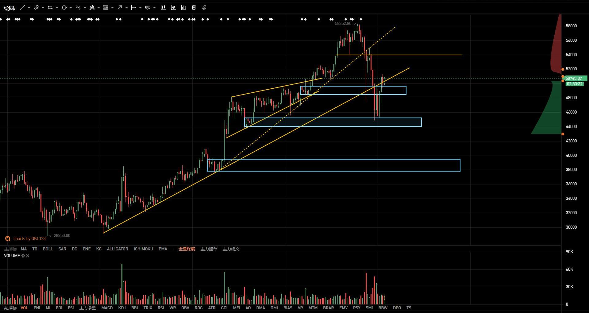 上期报告中说到,若比特币跌破补充趋势线和54000一线则可能迎来较大调整,如图所示,比特币跌破后迎来近万美金调整空间,短期于44800附近止跌,可视为短期支撑位,下方有效支撑关注图中最下方蓝色矩形区间37800-39400;当前比特币重新回到50000以上,若站稳图中黄色斜向趋势线,则有可能进一步冲击54000附近。