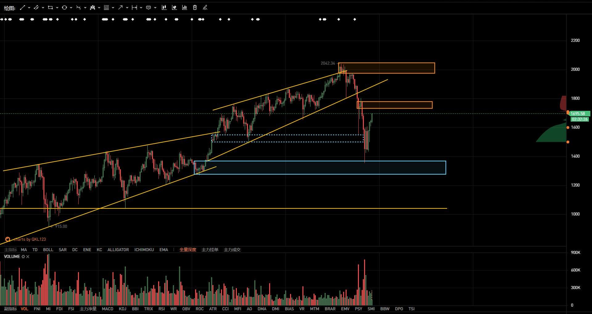 以太坊与比特币形态结构类似,均出现“V转”形态。前日初次下杀于上期报告中所画蓝色矩形位置1550有效止跌,昨日二次下杀打出短期低点1355,并于此位置止跌,该位置附近可视为短期支撑,即图中蓝色实线矩形区间1300-1370;上方短期压力关注供应柱上缘附近1730-1770。
