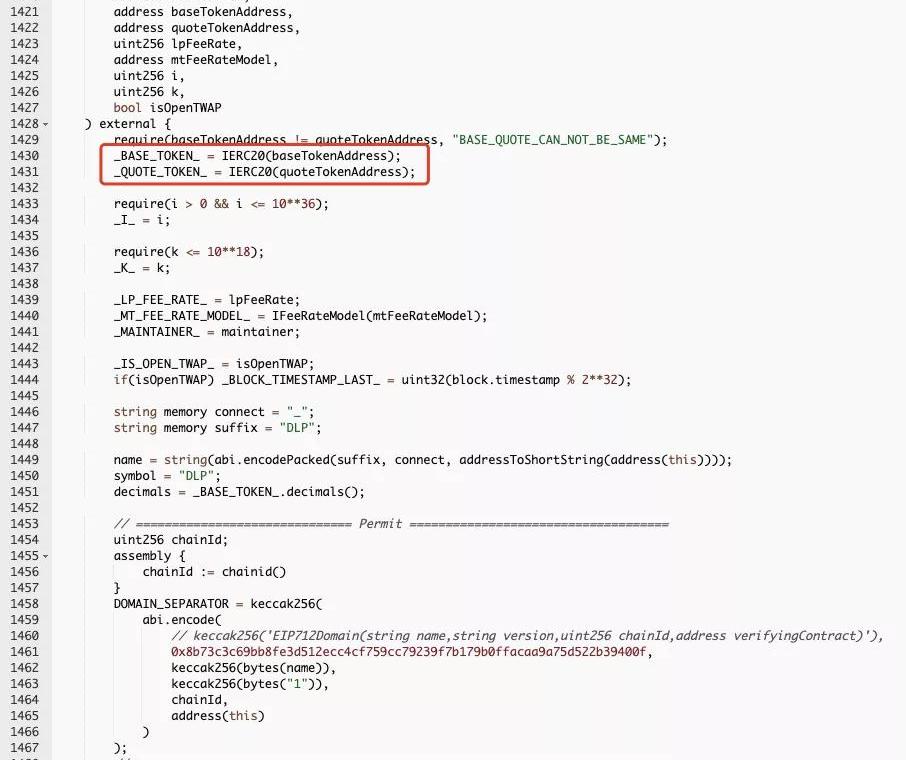 通过分析具体代码我们可以发现,在进行闪电贷时会先通过_transferBaseOut和_transferQuoteOut函数将资金转出,然后通过DVMFlashLoanCall函数进行具体外部逻辑调用,最后再对合约的资金进行检查。可以发现这是正常闪电贷功能,那么问题只能出在闪电贷时对外部逻辑的执行上。