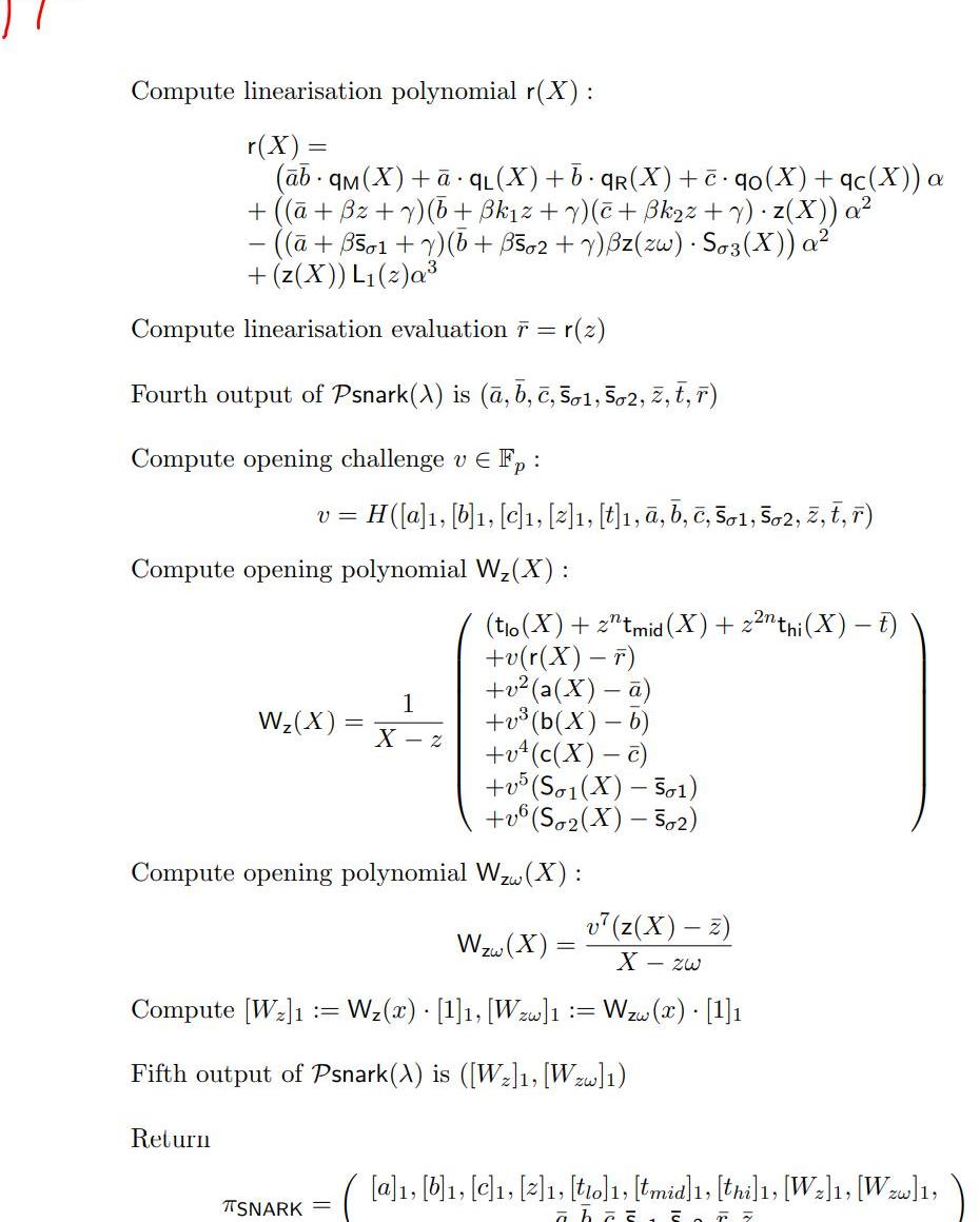 3.Wz(X)对应多项式协议里的CreateWitness操作,证明这些多项式r(X),a(X),b(X)等在x=z处的值确实等于r,a,b等,对Wzw(X)同理,并返回承诺值。