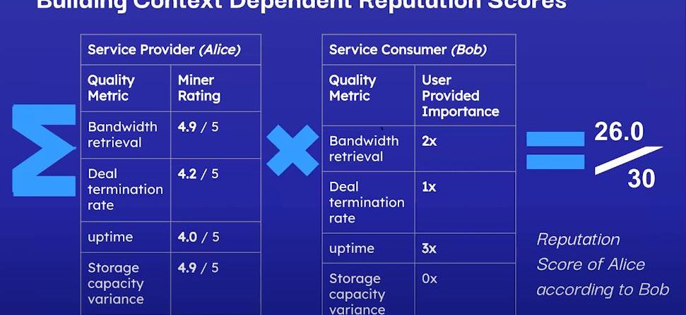 Filecoin网络的信用分数将会随着时间的流逝而变动。信用分在不同场景下的重要程度也是不一样的,例如,Alice是一个矿商,bob是一个客户,如果bob存储的数据量大,那么,bob可能关心的是存储,如果bob的数据存储量小但是使用频率高,那么,bob可能更关心的就是检索时间、交易终止的可能性以及运行时间。