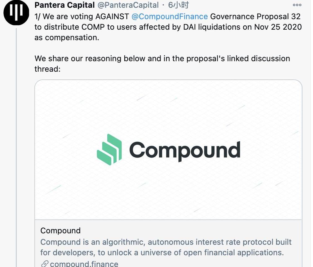 投资风投基金PanteraCapital发推表示反对Compound第32号治理提案,该提案要求将COMP分发给2020年11月25日受DAI清算影响的用户,作为补偿。目前有76%的多数票反对该提案。