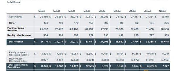 首先,营收、利润终于止跌开始回升。Meta一季度营业收入为286.45亿美元,同比增长3%,远远好于市场预期同比下降超0.8%的预期。而去年三季度和四季度分别下降4%和3%。稀释后每股净收益为2.20美元,虽然同比下降19%,但也远不及同比下降26%的市场预期,在去年四季度同比下降52%的基础上大大回升。