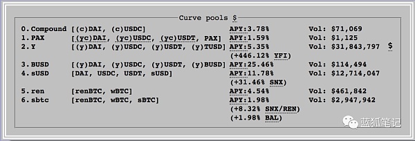 为Y池提供流动性,可以赚取YFI和CRV,在蓝狐笔记写稿时其APY为5.35%,不过YFI收益达到446.12%;