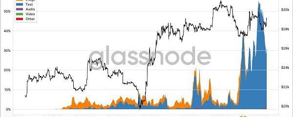 NFT叙事由来已久,因而此次Taproot交易数的上升,归因于文本类型铭文的大量增加。比特币网络中超过50%的交易与使用文本的铭文有关。