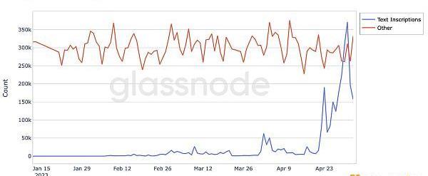 将与文本铭文相关的交易从所有交易中分离出来,可以清楚地看到,它们是最近比特币活动增加的唯一驱动因素,甚至在很短的时间内超过了所有其他交易数的总和。