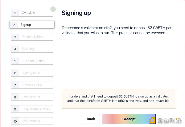 整个介绍部分还分为了这10个部分,每个部分都介绍了关于以太坊2.0的重点,这就好想是参与前要熟悉规则一样,这个还算比较贴心,不过这也代表着风险提示。只要点击每一步的“我接受”按钮即可,不过每个部分的内容要看一下。