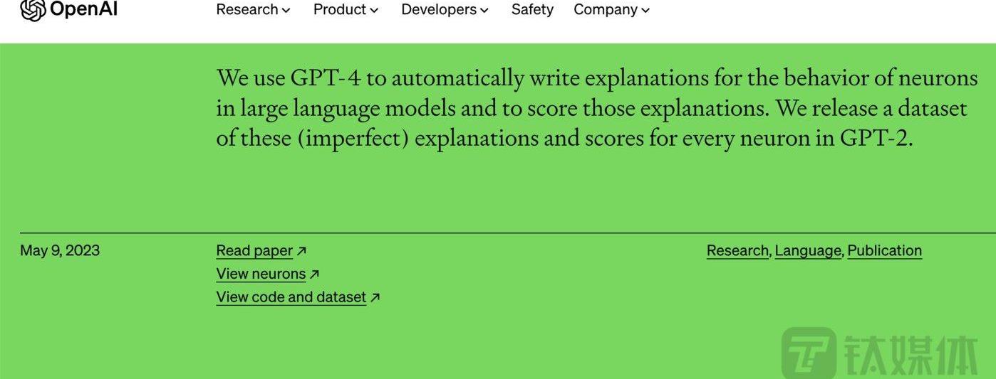 钛媒体App5月10日消息,OpenAI今晨发布一个关于GPT-4语言模型解析神经元的对齐性研究成果,利用自研基于GPT-4技术的开源工具,来尝试计算其他架构、更简单语言模型上神经元的行为并对其进行评分,而且可以将其应用于另一种语言模型中的神经元——本次选择4年前发布、包含307200个神经元的大模型GPT-2为实验样本,公开了这些GPT-2神经元解释和分数的数据集。