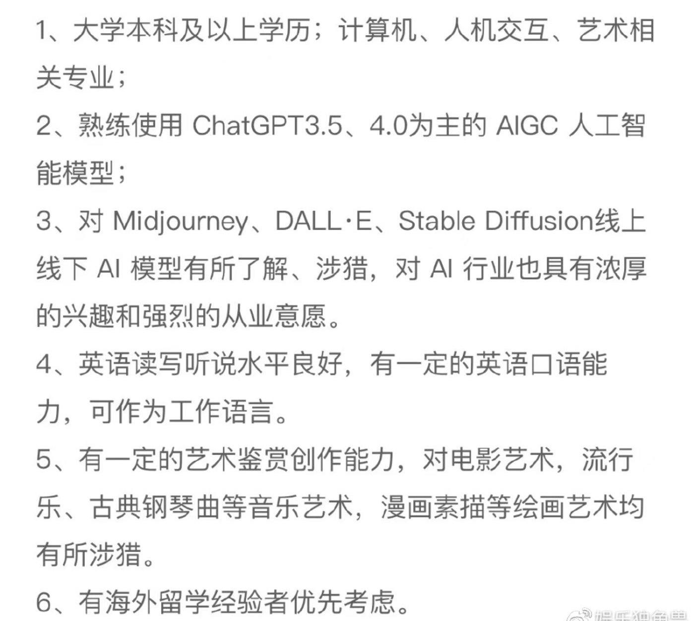 娱乐独角兽检索招聘软件发现,国内已经有部分公司征聘这类岗位。通常既要求计算机相关专业,对线上线下AI模型有所涉猎,还要具备一定的艺术鉴赏创作能力,对电影艺术、流行乐乃至古典钢琴曲、漫画素面等绘画艺术均有涉猎。属于复合型人才。有趣的是,一位海外从业者表示最好的提示工程师是哲学家。“好的提示包括写出极其清晰的解释,并找出造成误解的原因以及如何避免误解。”