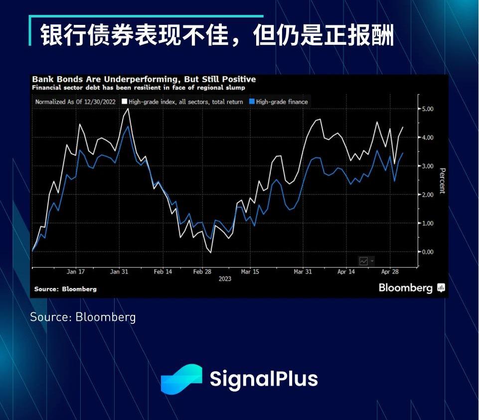 在存款方面,像WesternAlliance这样的区域性银行其实已经看到客户存款有所恢复,甚至在最近的5月第一周也是如此。此外,虽然银行股正经历血洗,但整体来看,银行债券在整个走势中都表现出韧性,实际上,债券已经回升至今年以来的高点。