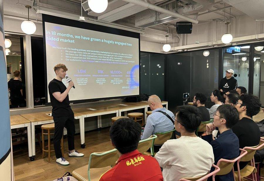 MagicEden核心开发者MatthewWilliams用一个短片在现场分享了MagicEden比特币NFT交易市场开发背后的故事,整个团队聚集在一间别墅里完成了MagicEden比特币NFT交易市场的构建,十分有趣。Matthew着重提及了他所认为的比特币NFT相较于其他链上NFT的优势,比如全链上、不可更改性等。同时也介绍了MagicEden在比特币NFT的交易方面所做出的一些优化,比如PSBT、不同钱包在不同市场间的兼容性等。Matthew很风趣也很随和,在演讲结束后有现场的朋友问了他一些SolanaNFT相关的问题,他也笑着给出了他的回答。