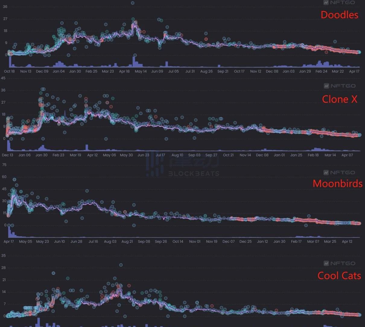 BlockBeats:Doodles、CloneX、Moonbirds、CoolCats等老蓝筹持续下跌,除了NFT市场冷淡,还有什么原因让他们掉队了?