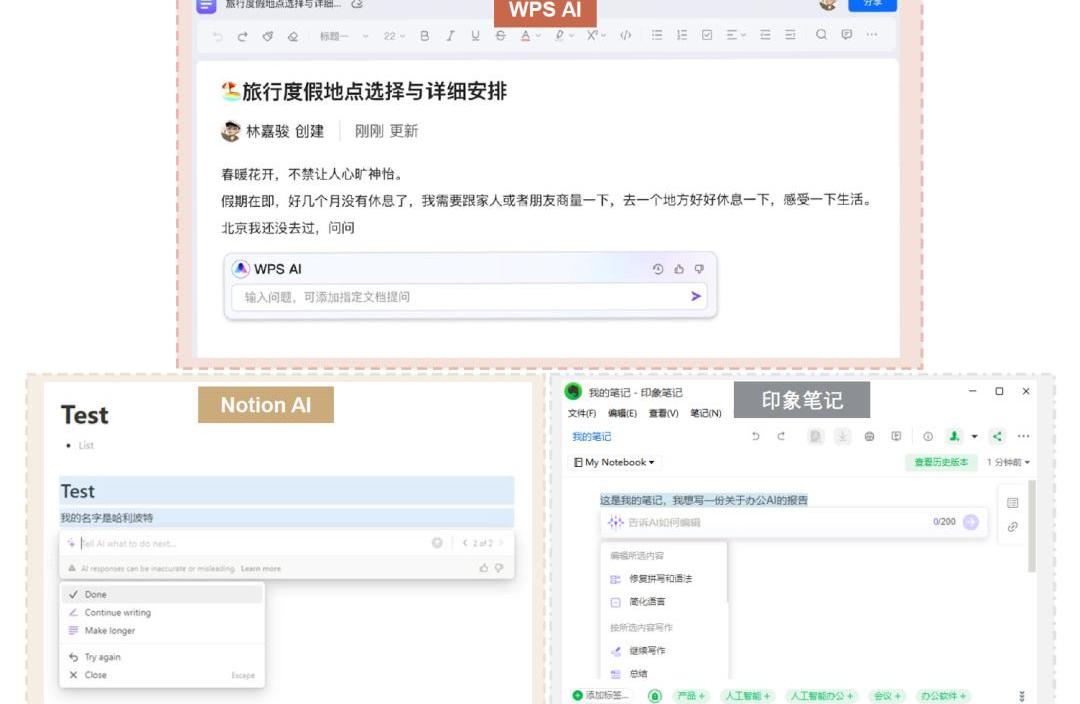 ?交互界面:较为类似,以浮窗方式内嵌在文本编辑界面中,轻松唤醒AI助手。唤起方式上,NotionAI为输入空格键或“/”,印象超级笔记为点击“+”或按下“/”键,WPS中通过Ctril+J或“/”。弹出的浮窗内提供多种AI助手功能,协助用户创作,提升效率。